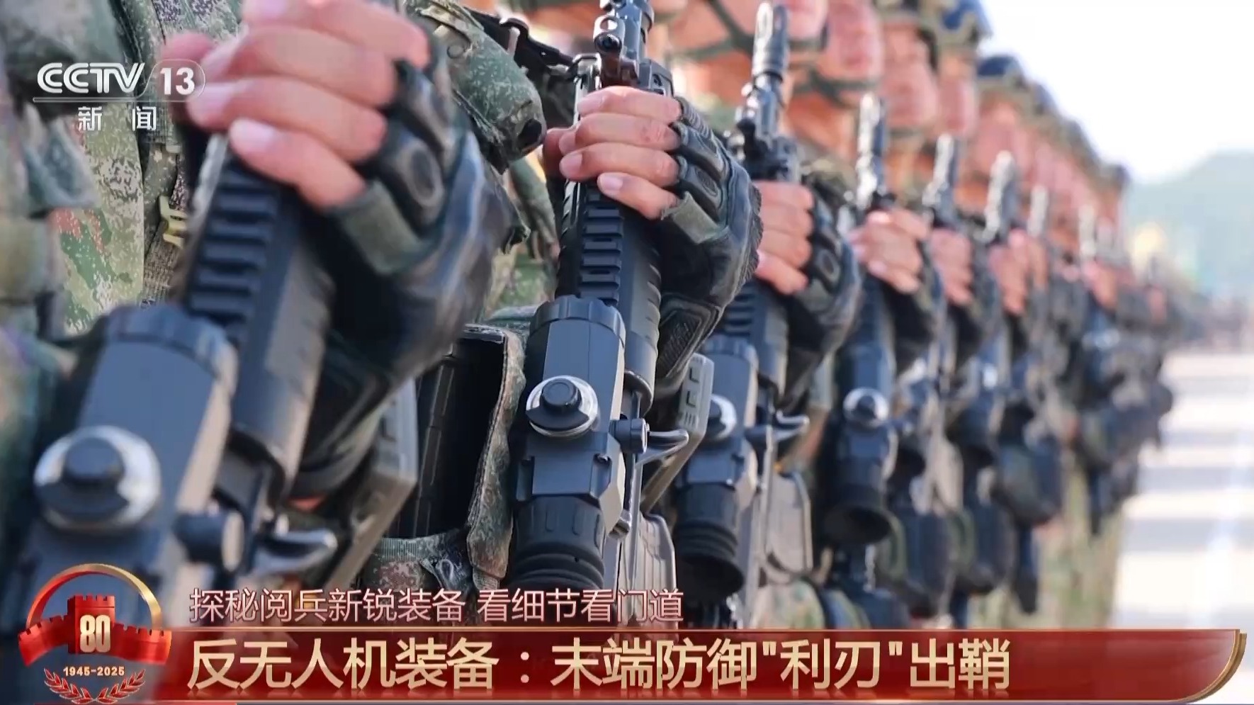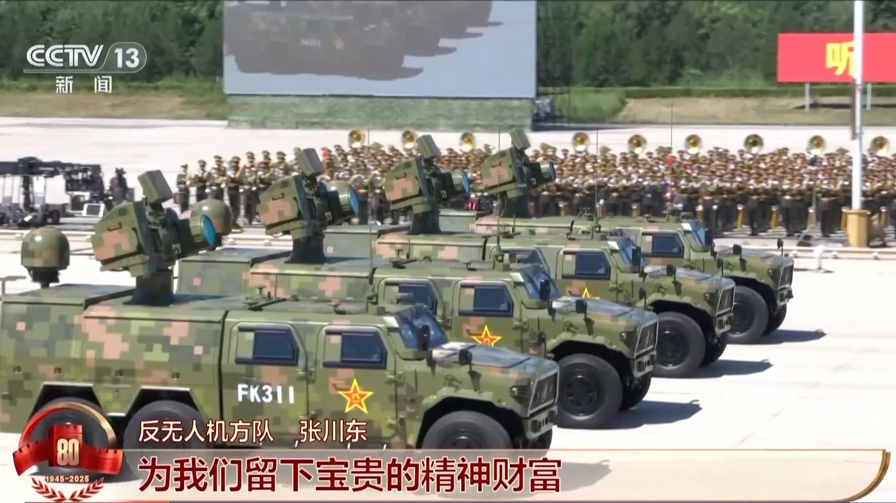 反无人机方队张川东:我是方队的一名驾驶员,也是来自红军旅的一名战士,这装备是我在连队的“好战友”。抗战时期,我们的革命先烈们用落后的武器装备战胜了强大的敌人,他们生不畏死、悍不服输,用单薄的身躯挺起民族脊梁,为我们留下宝贵的精神财富。我们要传承红色血脉,弘扬伟大抗战精神,练好练精手中武器,战胜一切来犯之敌。